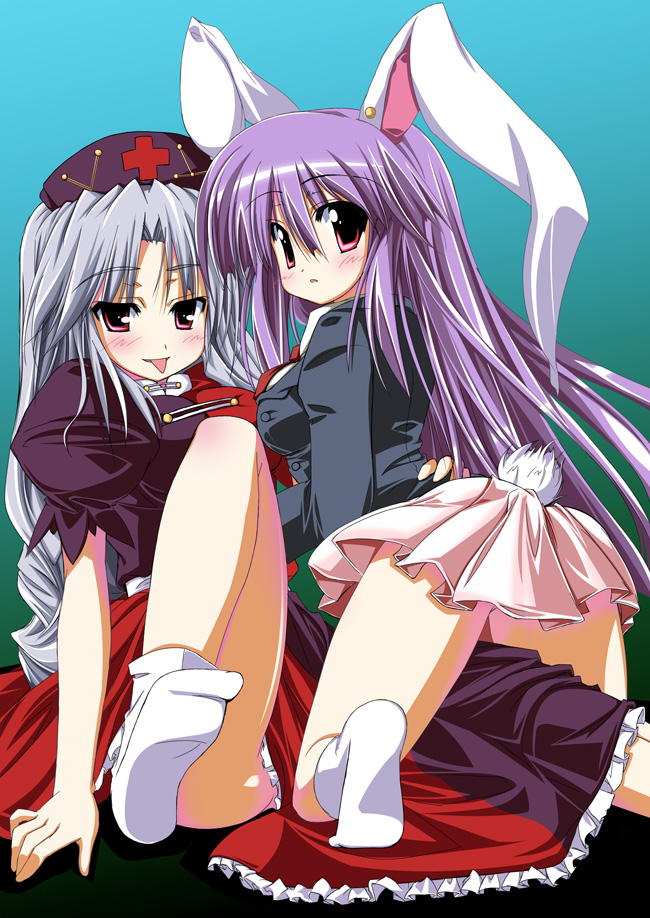 2girlsanimal earsassblazerbraidfemale focusgradient backgroundhatjacketkneelinglong hairmultiple girlsnecktiepurple hairrabbit earsred eyessittingtailtongue