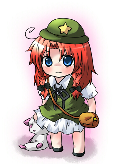 1girladapted costumeaged downbagblue eyesblushbraidchibifemale focushatkindergartenkindergarten uniformred hairribbonsatchelschool hatsolostuffed animalstuffed toyteddy beartwin braids
