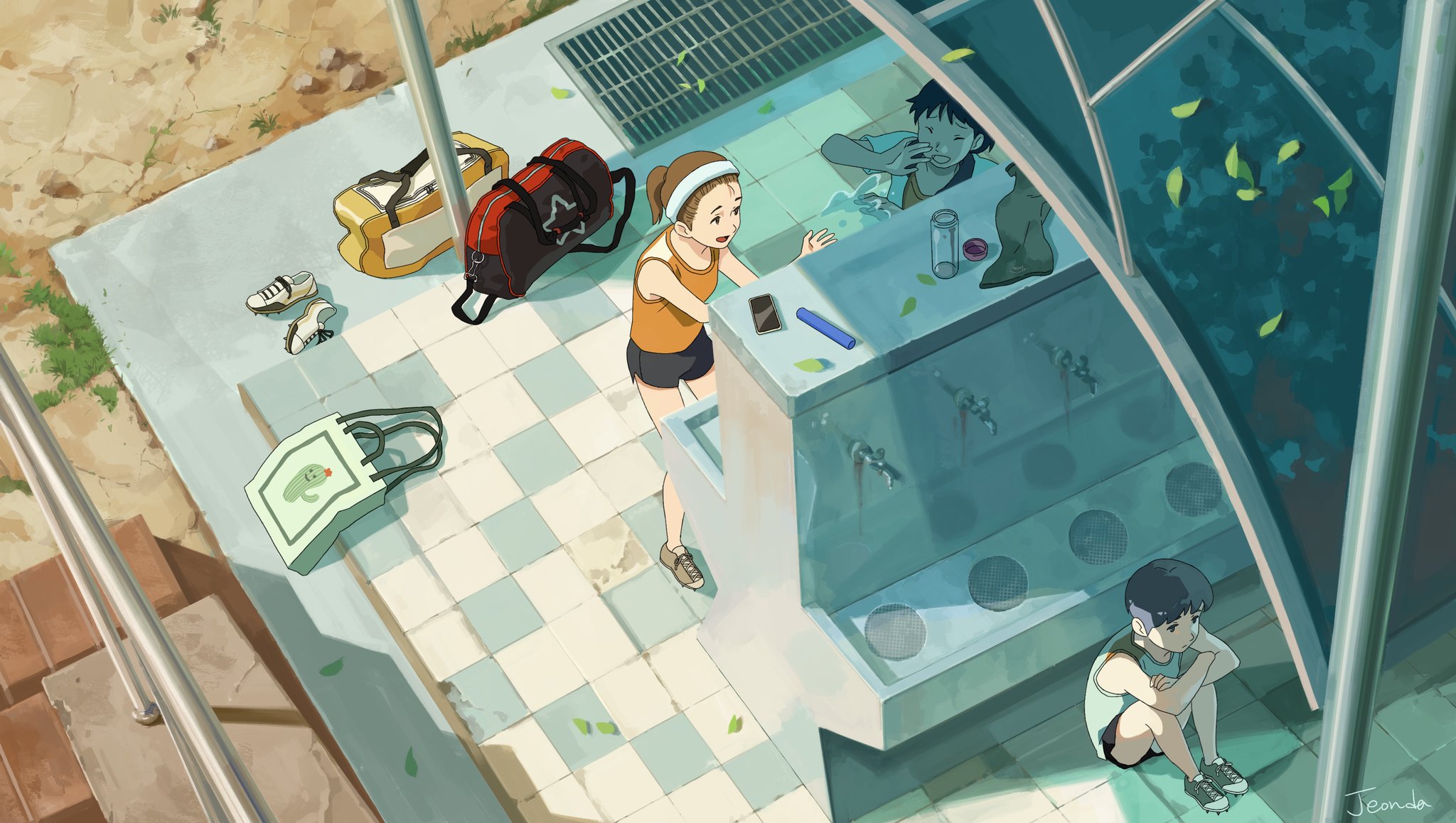 2girlsblack hairblack shortsdaydrain (object)from aboveguttergym shortsmultiple girlssheltershortsslice of lifestorm drainsunlighttank toptea soteartile floortiles