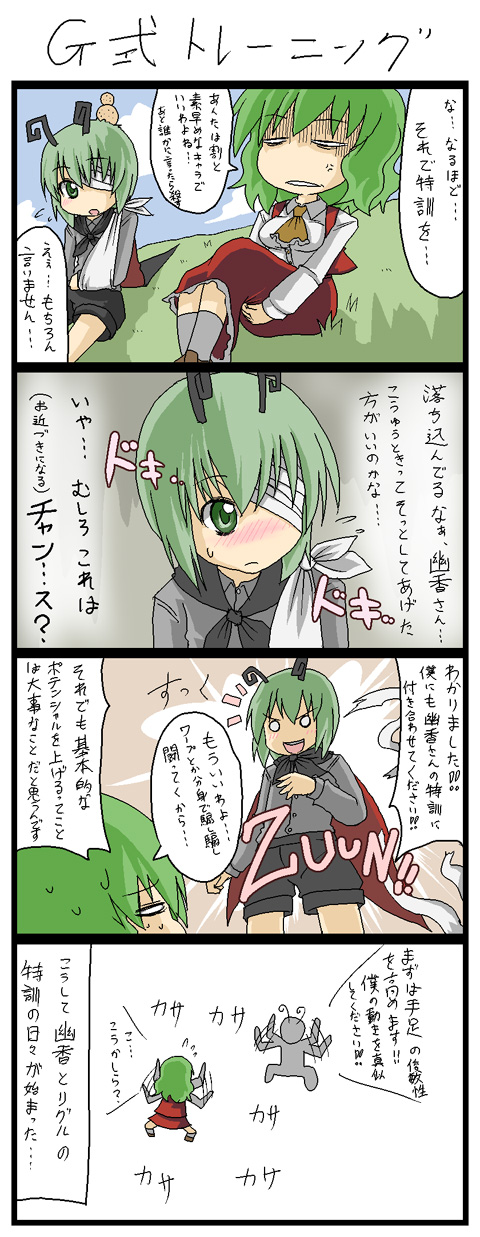 2girls4komaanger veinannoyedantennaeascotbandagesblushcomicfemale focusgreen eyesgreen hairmultiple girlsshaded facevest