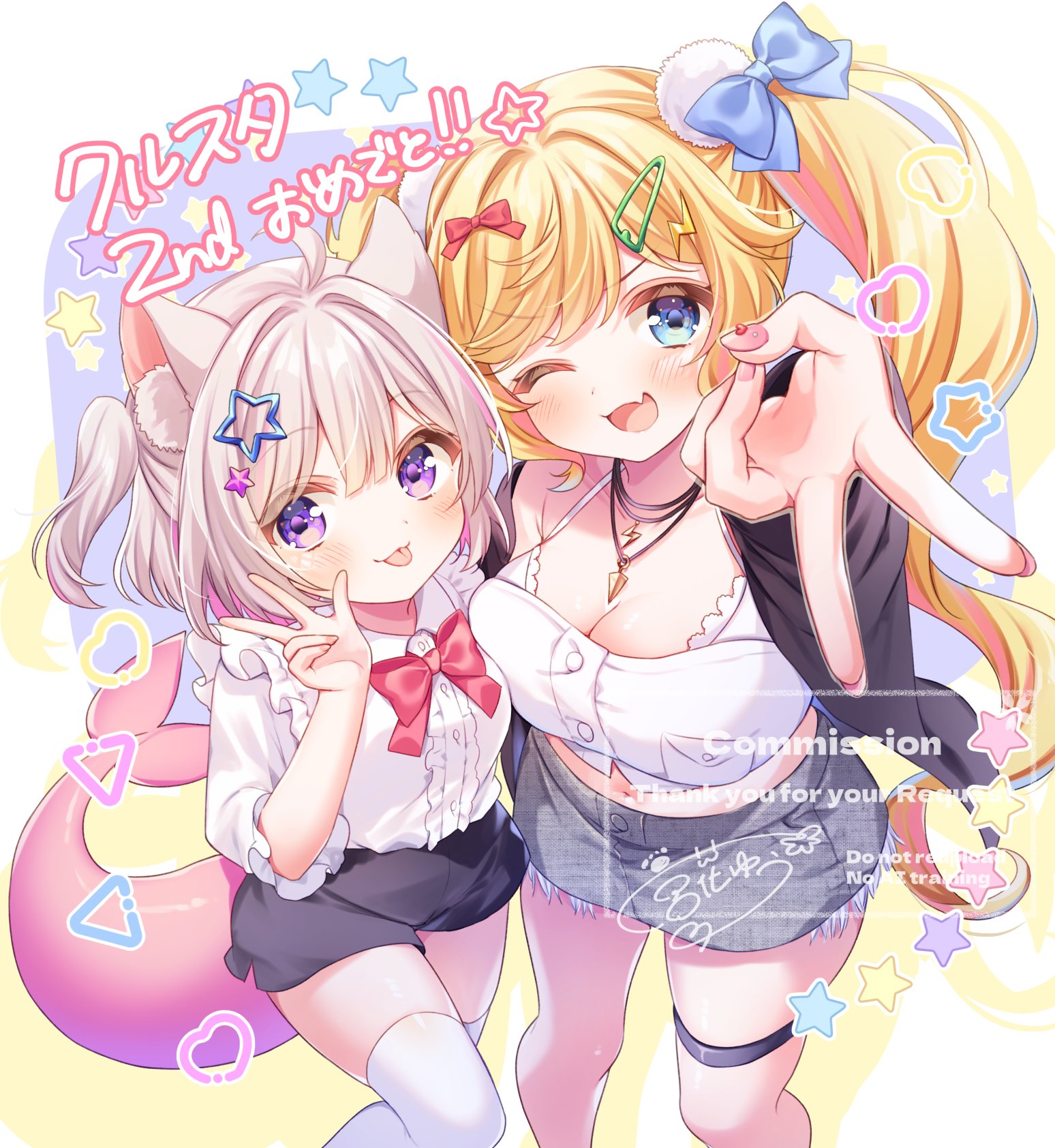 junsuina fujunbutsu, augusta (wuthering waves), female rover (wuthering waves), rover (wuthering waves), wuthering waves, absurdres, commentary, english commentary, highres, official art, second-party source, 2girls, ancient greek clothes, arm armor, armor, black collar, black hair, breastplate, breasts, can, closed mouth, collar, drink can, earrings, english text, greco-roman clothes, hair between eyes, hair ornament, hair ribbon, hairclip, headgear, holding, holding can, jewelry, long hair, medium breasts, multiple girls, one eye closed, open mouth, orange hair, parallel hairclips, red eyes, ribbon, smile, sun earrings, sun necklace, triangle earrings, yellow eyes, yellow ribbon