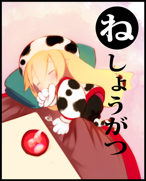 00s1girl2009animal printclosed eyescow printfemale focuskotatsunew yearpillowsleepingsolotablethumb suckingzouni soup