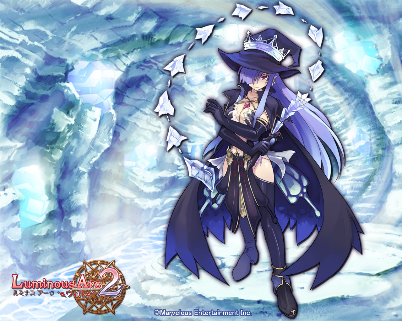 1girlblue hairbootsbreastscleavagecrossed armscrownearringselbow glovesfemale focusgloveshair over one eyehathip focusicejewelrylarge breastslong hairmidriffnavelpendantpurple eyessolothigh bootsthighhighswhite crownwitchwitch hat