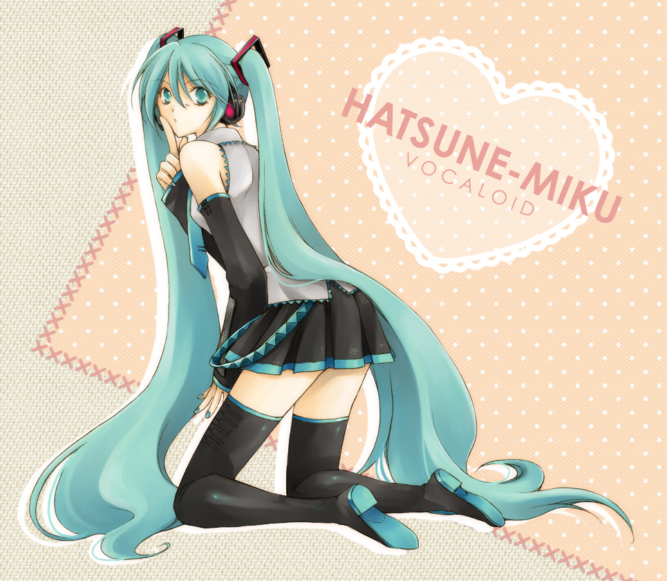 aqua eyesaqua hairdetached sleeveskneelinglong hairlooking backskirtsolothighhighstwintailsvery long hair