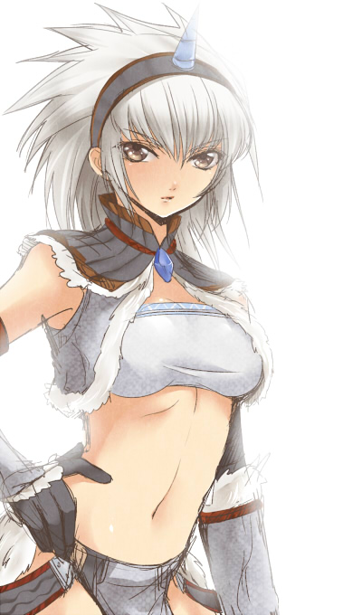 1girlbandeaubreastsbrown eyesdetached sleevesfemale focushairbandhornskirin (armor)large breastsmidriffnavelshort hairsingle hornsolostraplesstube topwhite hair