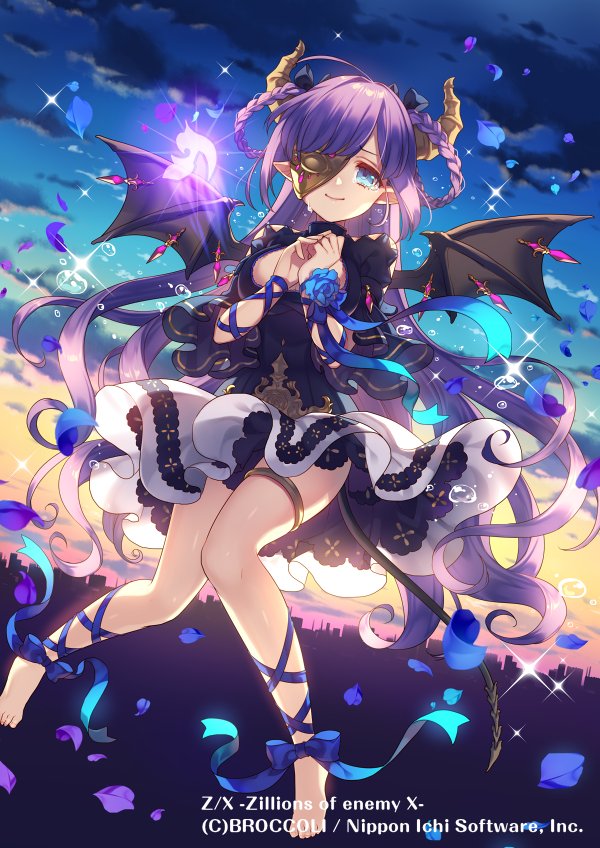 1girlahogebarefootblack dressblue eyesblue petalsblue ribbonbraidbraided hair ringsbreastsbrown hornscleavagecleavage cutoutclosed mouthclothing cutoutcloudcloudy skycopyright noticedemon girldemon hornsdemon taildressfloatinggradient skyhair ringshornsleg ribbonlong hairone eye coveredoutdoorspurple hairpurple petalsribbonskysolosparkletailtearsthigh strapugly (z/x)water drop