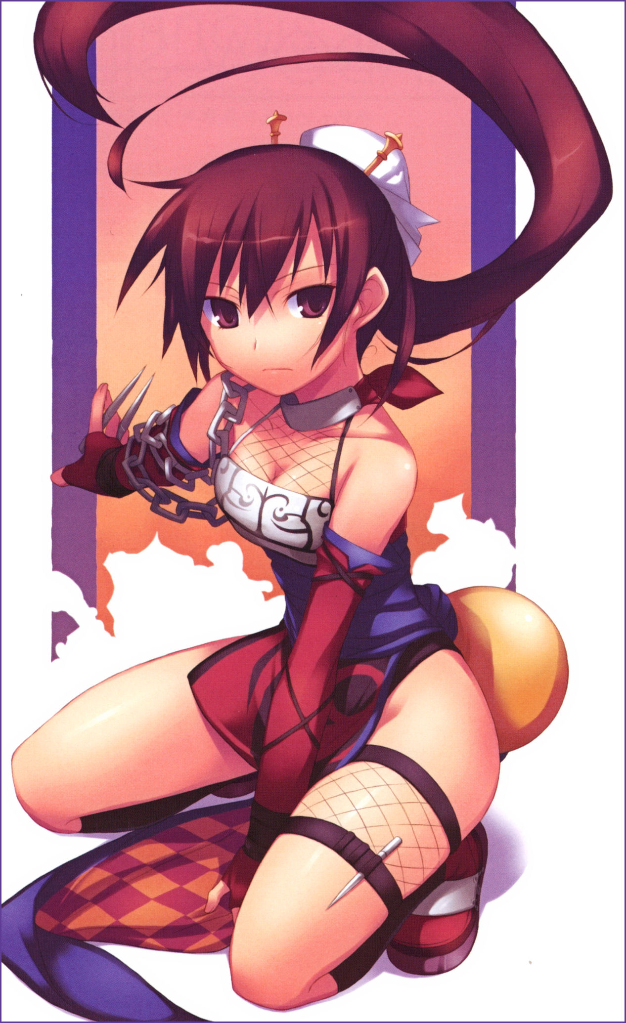 1girlbare shouldersbreastsbrown hairbun coverchaincleavageelbow glovesfemale focusfingerless glovesfishnetsgloveshair bunhair ornamenthairpinhip focusholsterkneehighslegslong hairneedleninjaponytailpurple eyessingle hair bunsockssolothigh strap