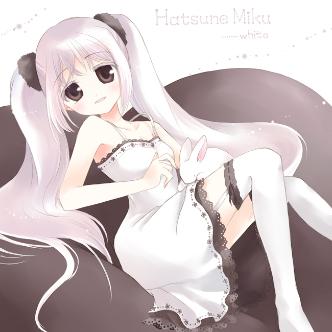 1girlalternate coloralternate hair colorbrown eyesdressfemale focusgarter beltgarter strapslong hairrabbitscrunchiesittingsolothighhighstwintailswhite hair
