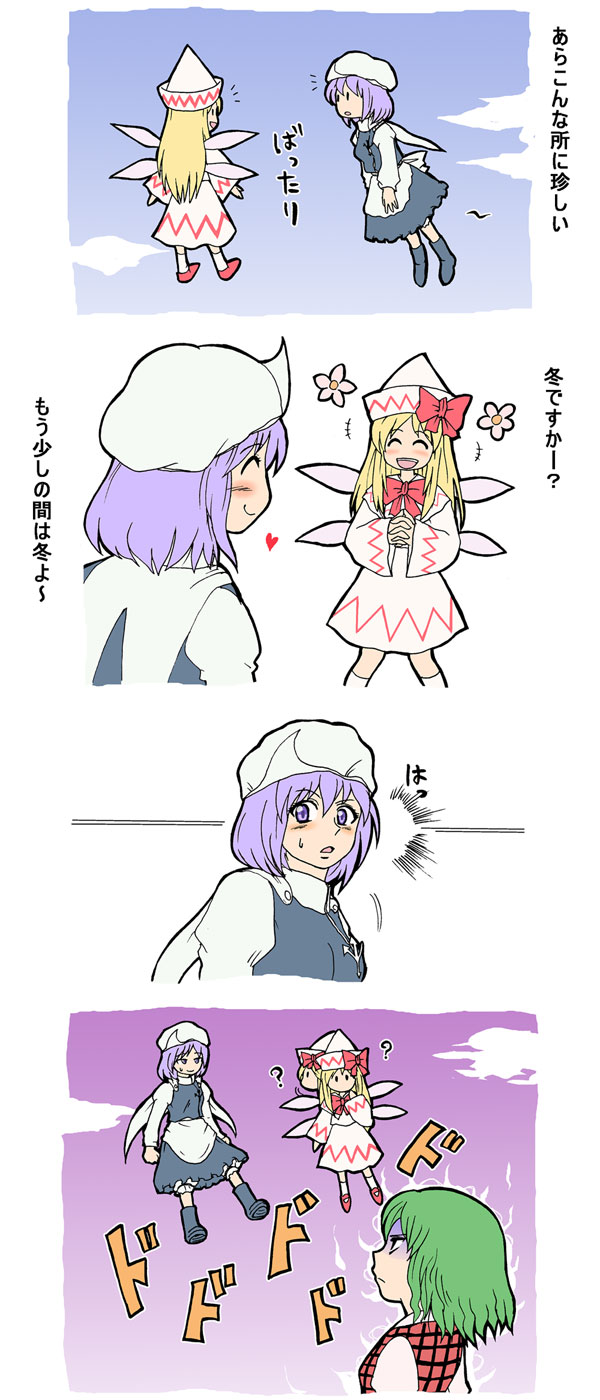 shishimaru ken'ya, aruma (shinrabanshou), claudia (shinrabanshou), shinrabanshou, translation request, 2girls, angel wings, blonde hair, blue eyes, blue hair, breasts, censored, flat chest, green eyes, hair ribbon, half updo, long hair, multiple girls, nipples, nude, pussy, ribbon, small breasts, thighhighs, wings, yuri