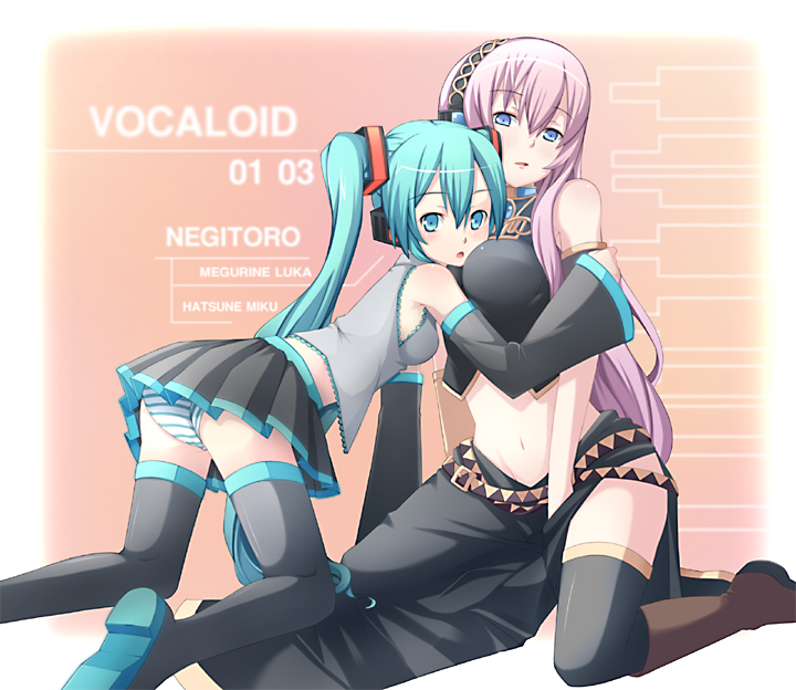 2girlsall foursaqua eyesaqua hairblue eyesblushbootsbreast pressbreastsdetached sleeveshairbandknee bootslarge breastslong hairmedium breastsmidriffmultiple girlspantiespantyshotpink hairskirtstriped clothesstriped pantiesthighhighstwintailsunderwearyuri