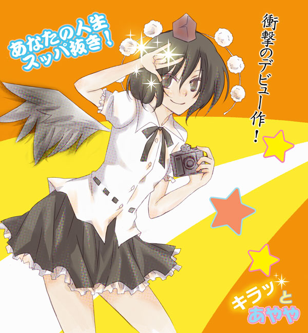1girlblack hairblack wingscamerafemale focushatm/seikan hikoushort hairsolosparklestandingstar (symbol)tokin hatwings