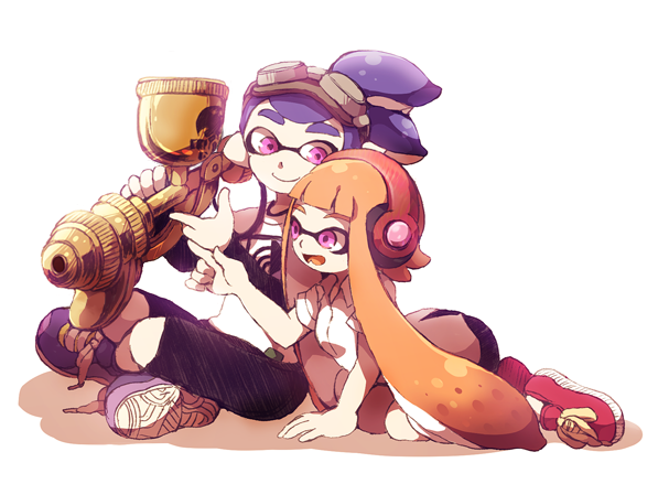 1boy1girlblack shortsblue hairclosed mouthcollared shirtgunheadphonesholdingholding gunholding weaponlong hairlooking at anotheropen mouthorange hairpurple shoesred shoesshirtshoesshort sleevesshortssimple backgroundsittingsmilesneakerstentacle hairweaponwhite backgroundwhite shirt
