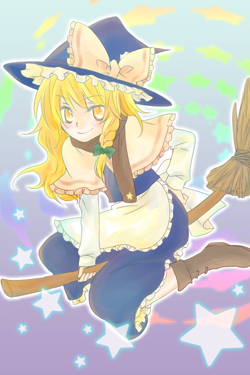 1girlblonde hairbraidbroombroom ridingdressfemale focusgradient backgroundhatribbonscarfsolostar (symbol)witchwitch hatyellow eyes