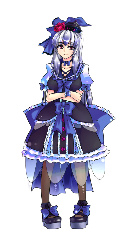 1girlbreastscrossed armsdressfemale focusflowerfrillsfull bodygothic lolitahatlolita fashionred eyesribbonsimple backgroundsolowhite backgroundwrist cuffs