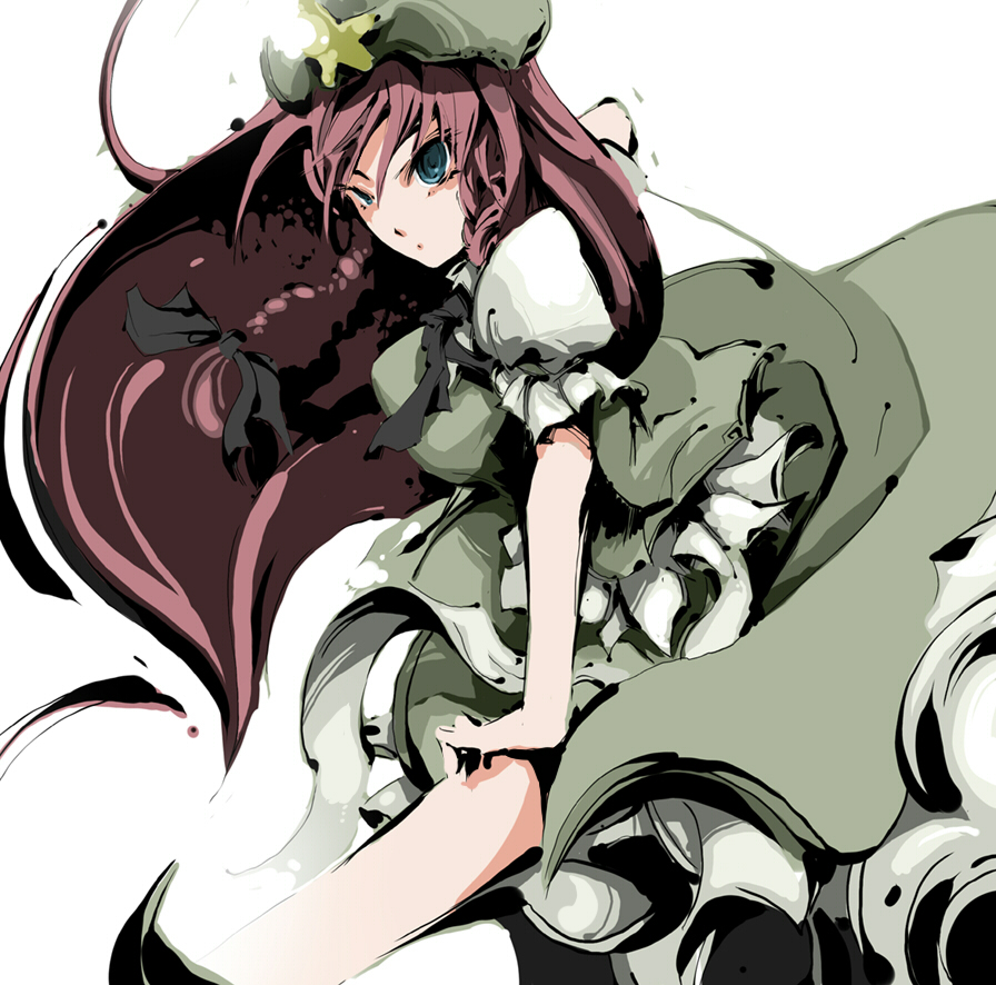 bun cover, china dress, chinese clothes, dress, flats, green eyes, green hair, loli, orange hair, red eyes, sandals, skirt