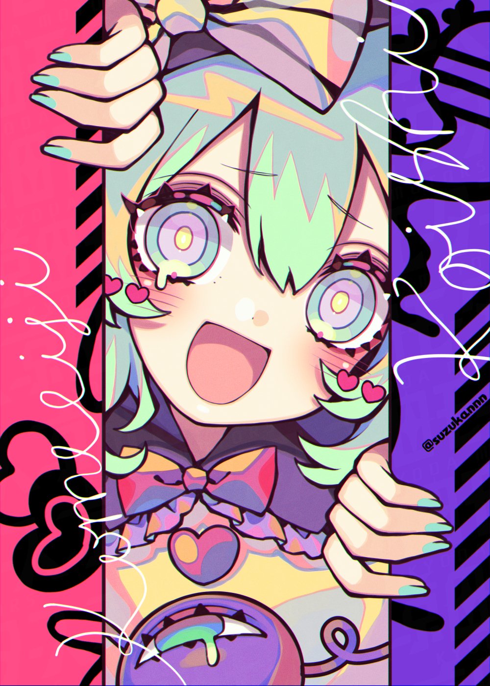 :d1girlblushbowbowtiecharacter namedouble-parted bangselbow cutouteyeballgreen hairgreen nailshair between eyesheartopen mouthred bowred bowtieringed eyessmilesolostriped bowtwitter usernameupper bodyyellow background