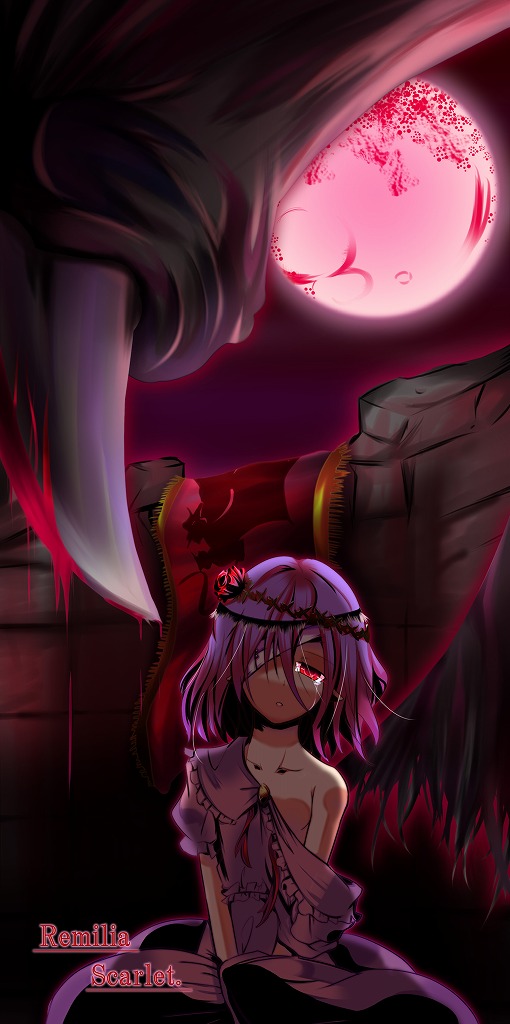 1girlbandage over one eyebandagesbare shouldersblue hairfemale focusfull moonmoonnightoff shoulderred eyesred moonruinsshort hairsittingsolotearswings