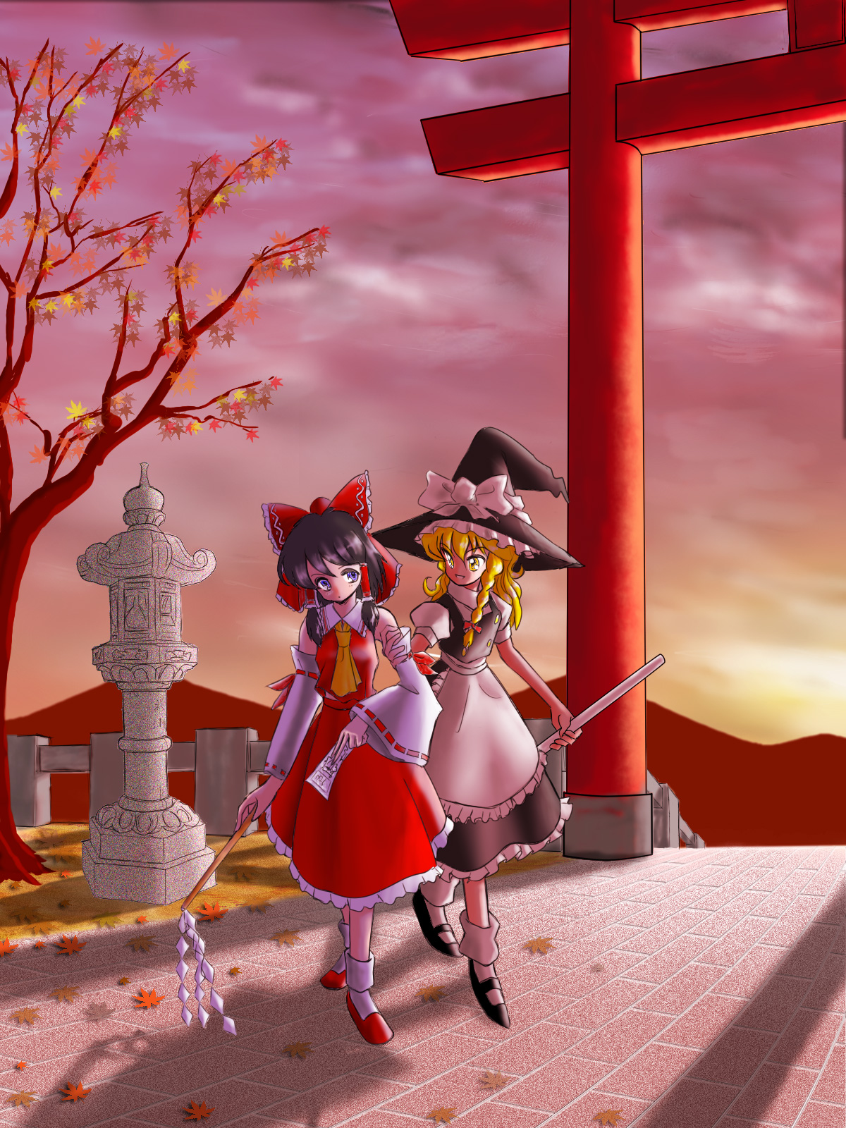 2girlsautumnblack hairblonde hairblue eyesdetached sleevesduskfemale focusgoheihatjapanese clothesleafmikomultiple girlsnatureoonusaoutdoorsplantribbonskirtskystone lanterntoriitreewitchwitch hatyellow eyes