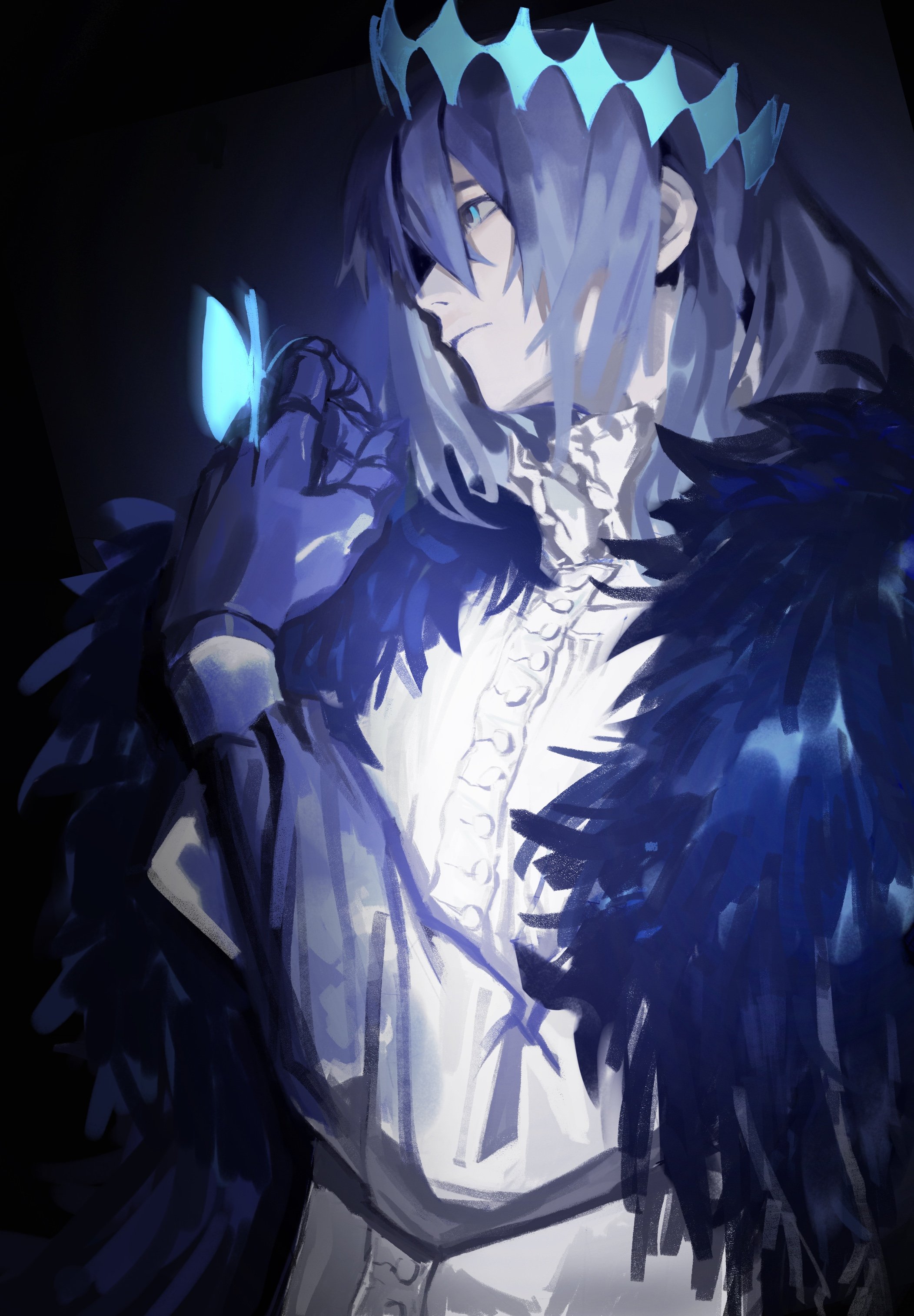 1boyarthropod boyarthropod limbsblack backgroundblue eyesbugbutterflybutterfly on handcapecrowndiamond hairbanddontuskwhyfur trimfur-trimmed capegrey hairinsectlong sleevesmale focusmedium hairshirtsimple backgroundsoloupper bodywhite shirt