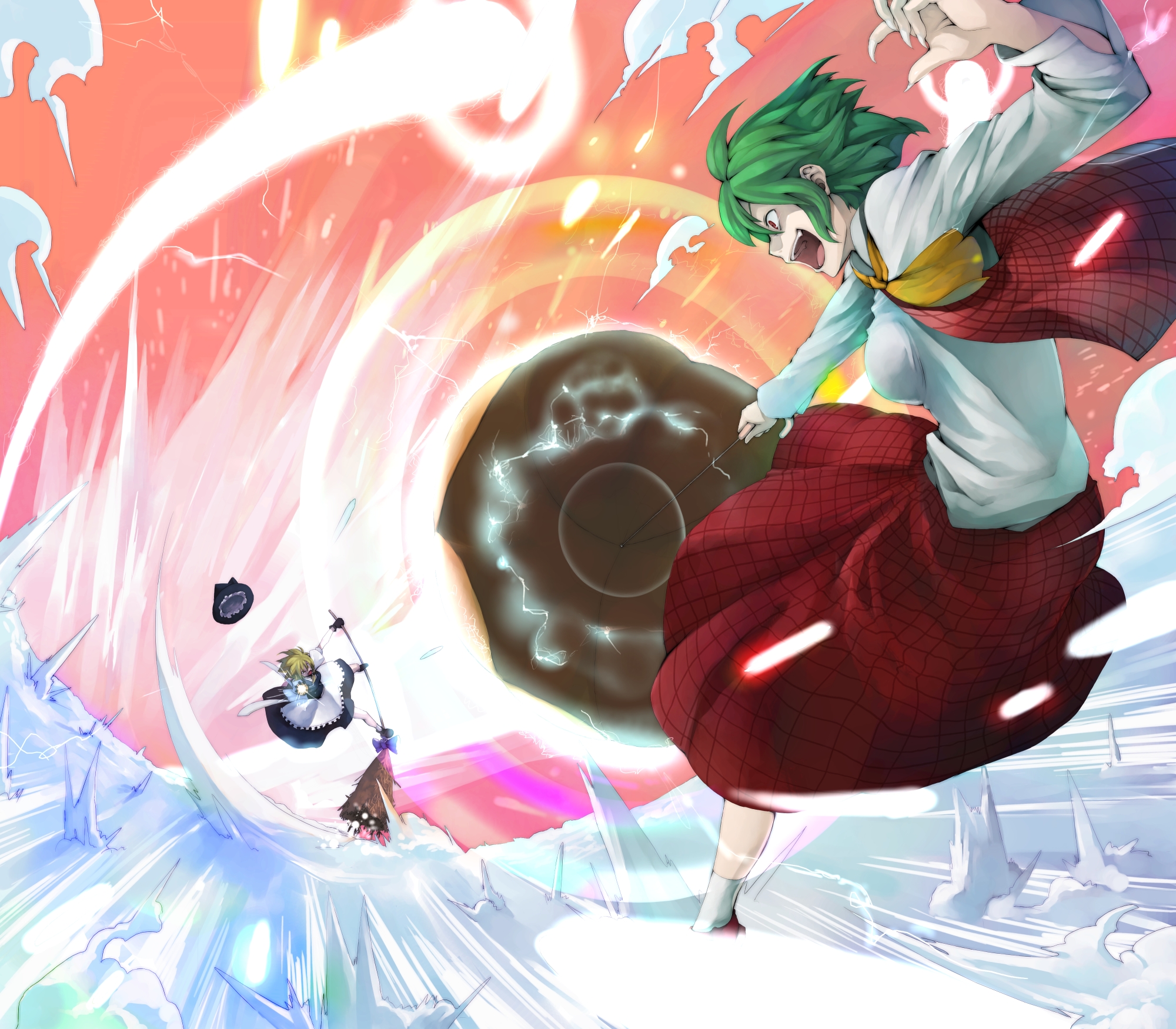 2girlsactionascotbattleblonde hairbroomcrazydanmakudestructionepicfemale focusgreen hairhatmaster sparkmultiple girlsopen mouthplaid clothesplaid skirtplaid vestred eyesshort hairskirtskirt setsnowumbrellavest