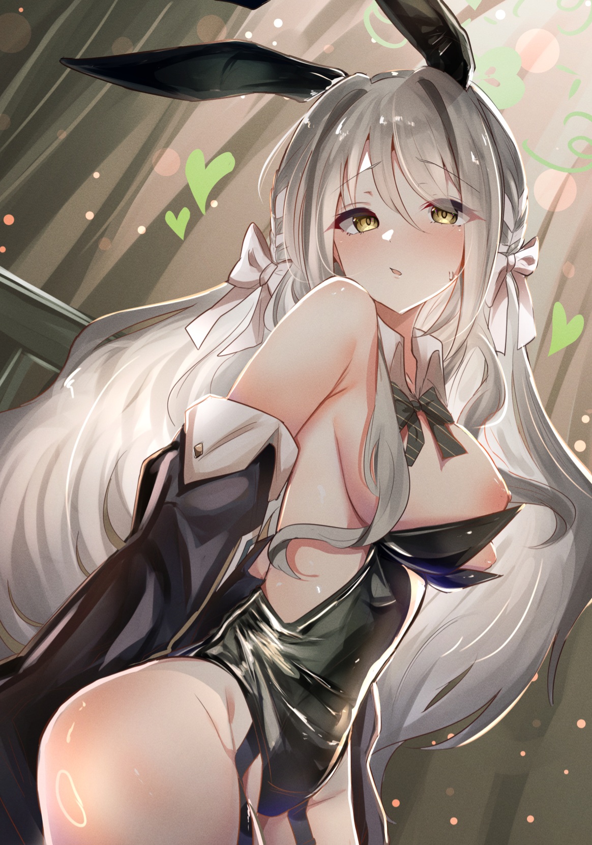 1girlalternate costumeanimal earsblack leotardbowbowtiebraidchoppy bangsdetached collarfake animal earsflower halogreen bowgreen bowtiegreen halohair ribbonhalohearthighleghighleg leotardleotardlong hairlooking at viewernipplesplayboy bunnyrabbit earsribbonribbon braidstraplessstrapless leotardstriped bowstriped bowtiestriped clothesundersized breast cupwhite bow