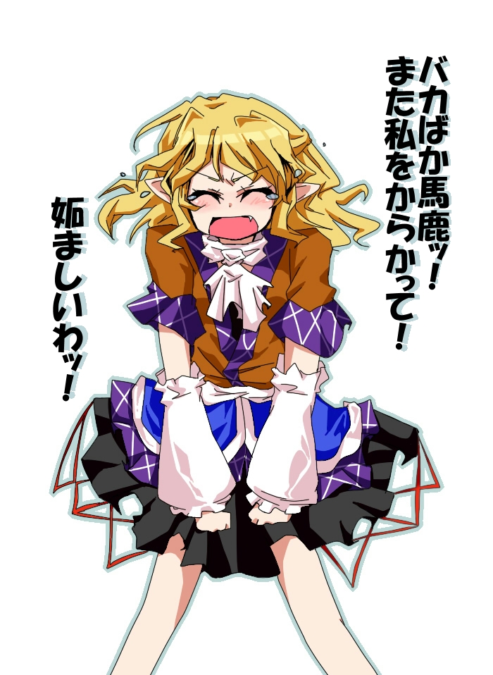1girlarm warmersblonde hairclosed eyesfangfemale focusjealouspointy earsscarfshort hairsolostandingtantrumtearswhite background