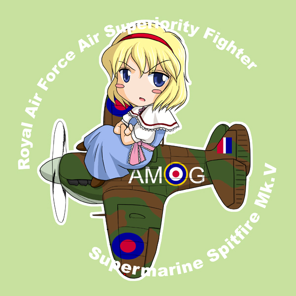 1girlaircraftairplaneblonde hairblue eyesblushchibicrossed armsfemale focushairbandmilitarysittingsolo