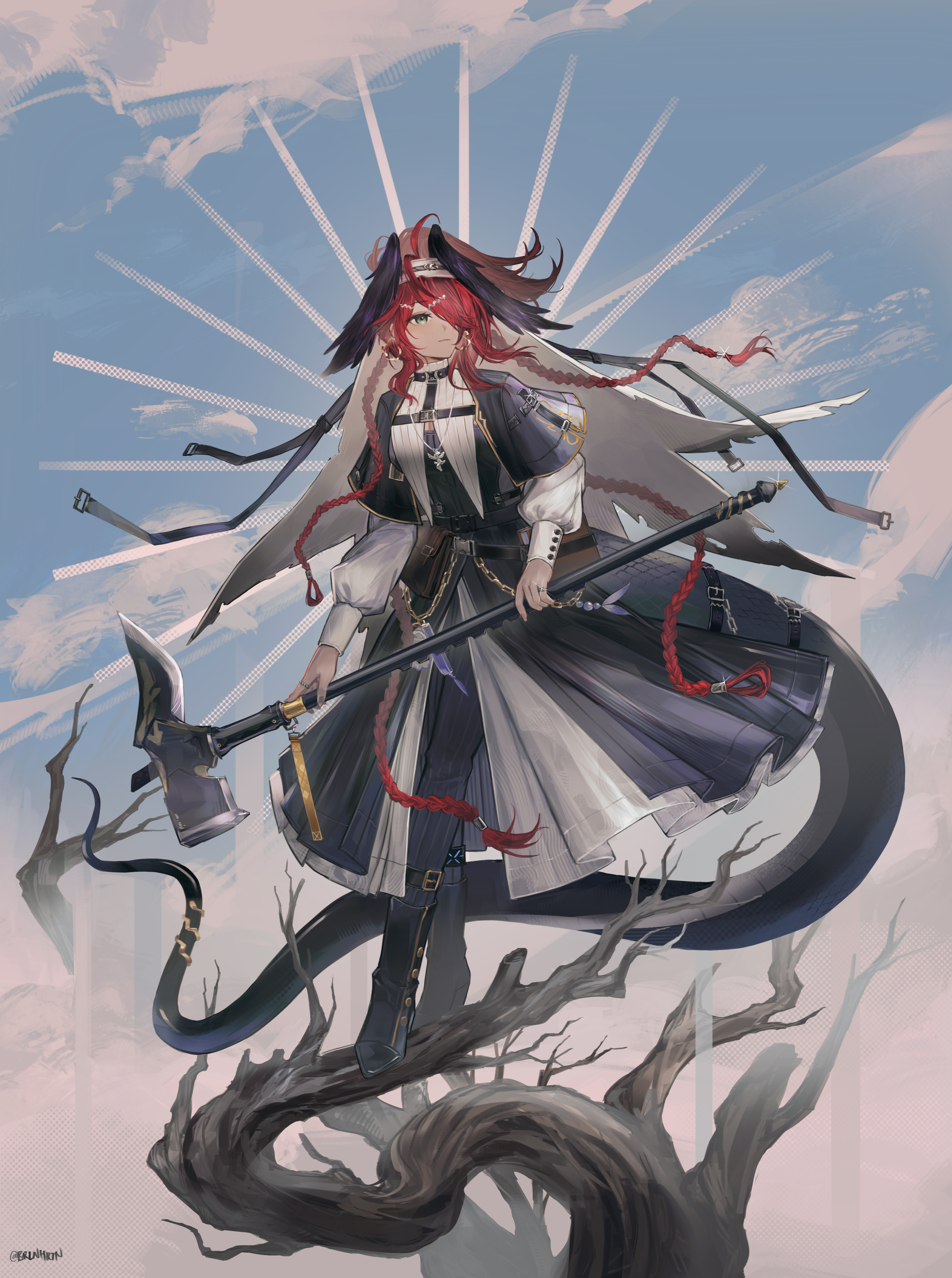 1girlblack capeletblack dressblack pantsbraidcapeletclosed mouthdressearringsfeathered wingsgracebearer (arknights)green eyeshair ornamenthair over one eyehead wingsholdingholding weaponjewelrylong hairlong sleeveslong tailmultiple braidspantspuffy sleevesred hairringshirtsnake tailsolotailweaponwhite shirtwide shotwings