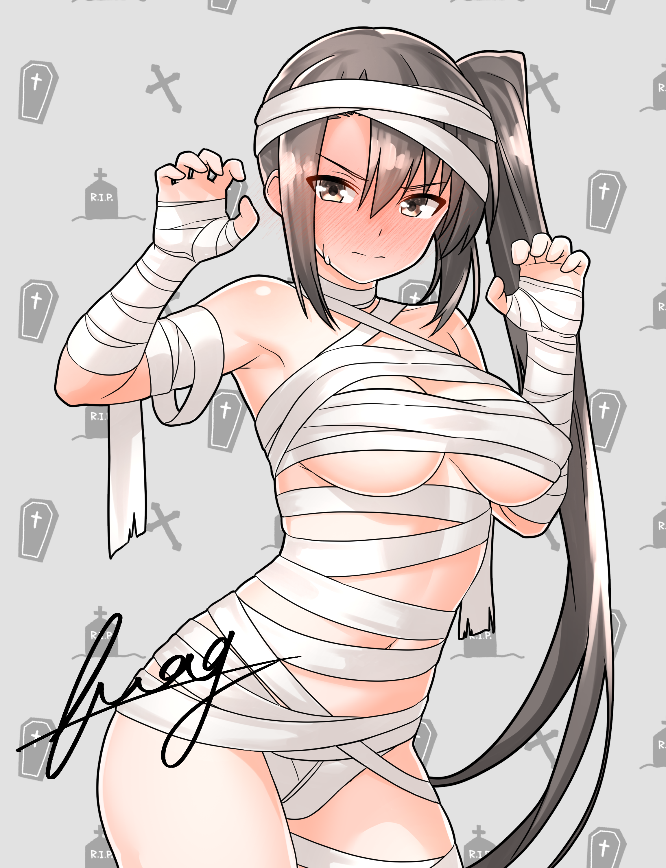 1girlartist nameblack hairbreastsbrown eyesclaw posecleavageclenched teethembarrassedlarge breastslong hairlooking at viewermummy costumenavelnipplesside ponytailsolostomachteeththighsunderboobwatermark