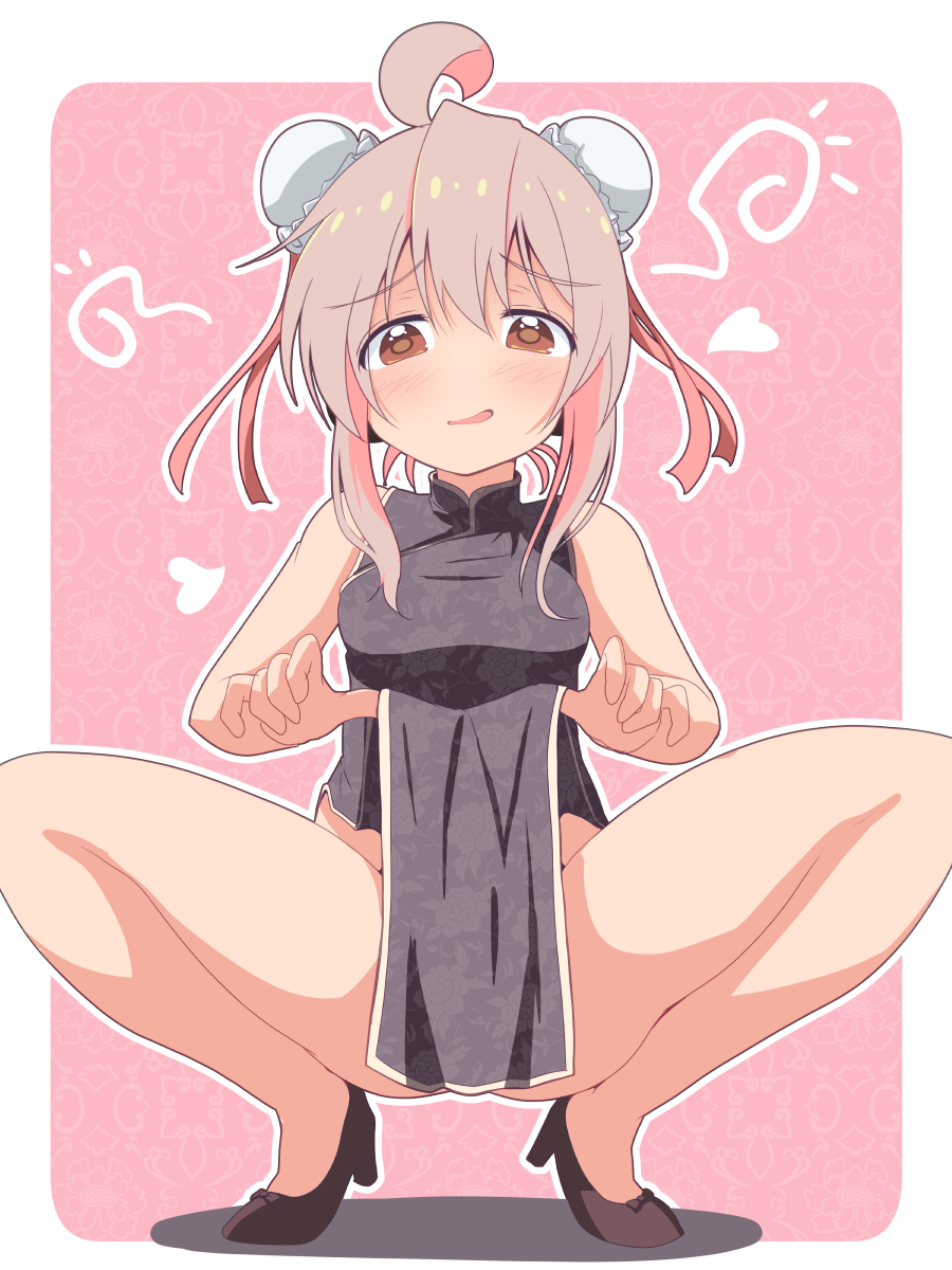 1girlahogealternate hairstylebare armsbare legsbare shouldersblack dressblushbreastsbrown eyesbun coverclothes liftdouble bundressfull bodyhair between eyeshair bunhair ribbonhearthigh heelslong hairlooking at viewermedium breastsno pantiesopen mouthoutlinepelvic curtainpelvic curtain liftpink backgroundpink hairribbonshoessimple backgroundsleevelesssleeveless dresssmilesolospread legssquattingstraight-onwhite outline