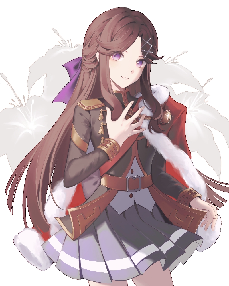 1girlbeltblack jacketbowbrown beltbrown haircowboy shotepaulettesfloral backgroundflowerfur trimfur-trimmed jacketgrey flowergrey skirthair bowhair ornamenthalf updohand on own chesthand upjacketjacket on shoulderslong hairlong sleeveslooking at viewerminiskirtparted bangsparted lipspleated skirtpurple bowred jacketred sashsashshirtshoulder sashsidelockssingle horizontal stripeskirtsmilesolostandingsymbol-shaped pupilstasselvery long hairwhite backgroundwhite shirtx hair ornament