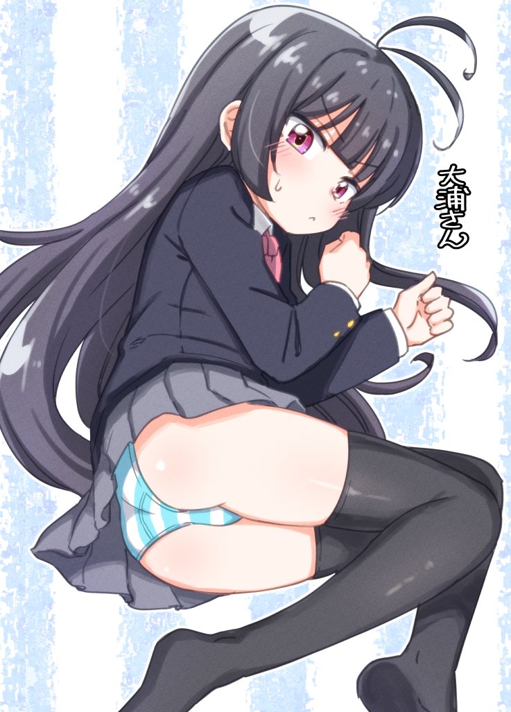 1girlantenna hairassblack hairblack jacketblack thighhighsblazerblue backgroundblue pantiesblushbowbowtieclosed mouthfeet out of framegrey skirtjacketlong hairlong sleeveslyingminiskirtno shoeson sideoutlinepantiespink bowpink bowtiepleated skirtpurple eyesschool uniformskirtsolostriped backgroundstriped clothesstriped pantiessweatdropthighhighsunderwearvertical-striped backgroundwhite outline