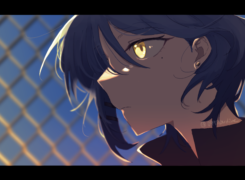 exusiai (arknights), exusiai (midnight delivery) (arknights), arknights, absurdres, chinese commentary, commentary request, highres, 1girl, adjusting headset, black gloves, closed mouth, detached wings, earpiece, energy wings, expressionless, fingerless gloves, gloves, halo, headset, looking at viewer, official alternate costume, red eyes, red hair, short hair, solo, traditional halo, upper body, wings, yellow halo, ztianyoshino
