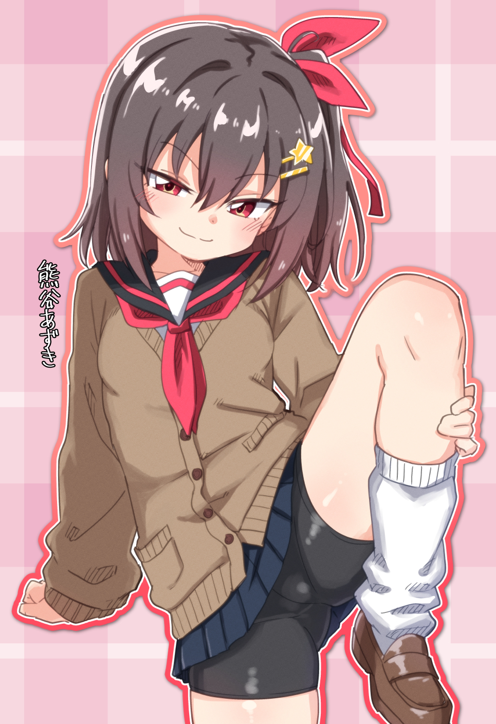 1girlbike shortsbike shorts under skirtblack sailor collarblue skirtblushbrown cardiganbrown hairbrown shoesbuttonscardiganclosed mouthcowboy shothair between eyeshair ornamenthair ribbonleg uploaferslong sleeveslooking at viewermedium hairminiskirtneckerchiefoutlinepink backgroundpleated skirtred eyesred neckerchiefred outlinered ribbonribbonsailor collarschool uniformserafukushoesskirtsmilesockssolostar (symbol)star hair ornamentwhite outlinewhite socks
