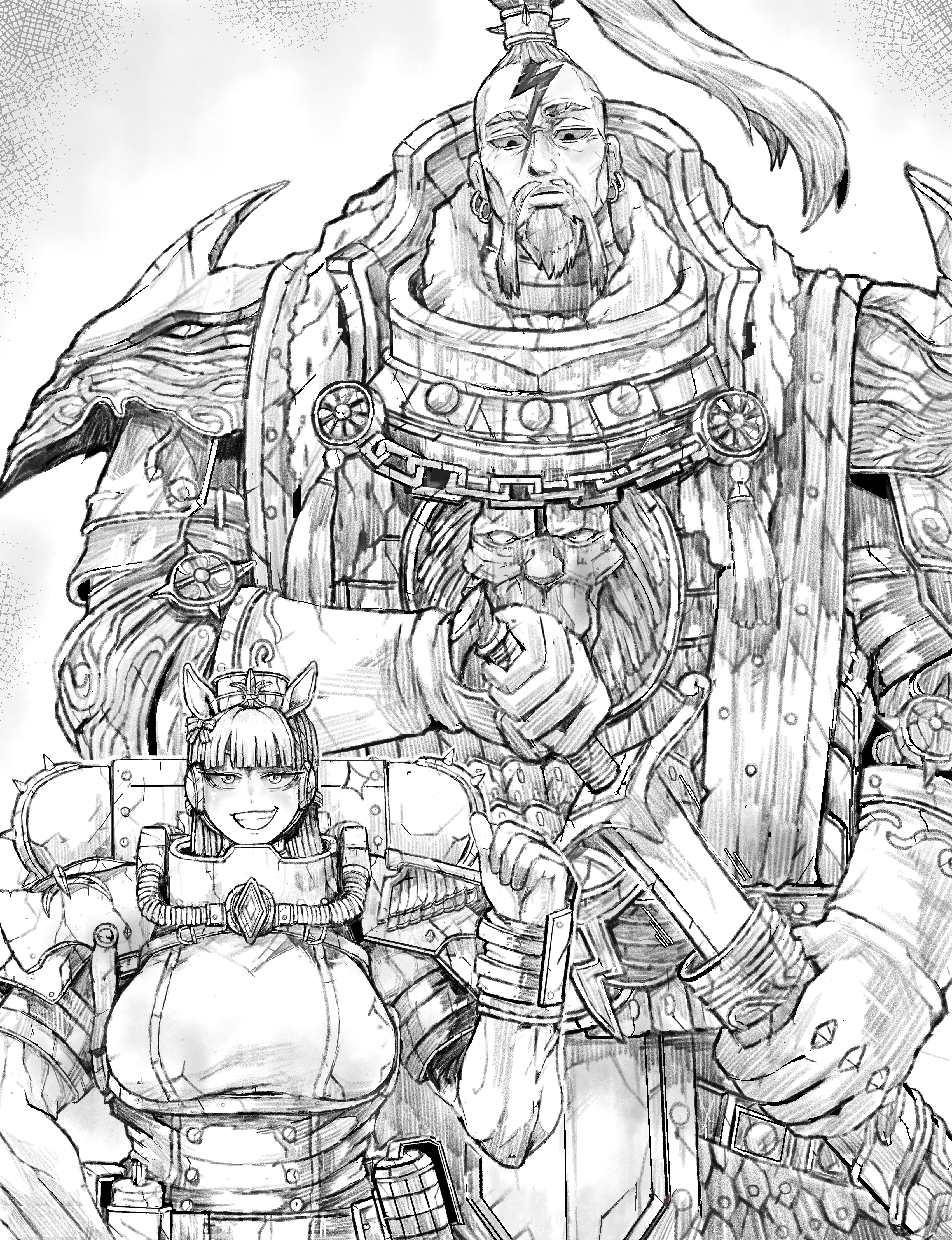 1boy1girlanimal earsarmorblunt bangsbowcrossoverear bowearringsexplosivegrenadegreyscalegrinholdingholding swordholding weaponhorse earsjewelrylightning bolt tattoolong hairlooking at viewermonochromemultiple earringspauldronspillbox hatpointingpower armorprimarchsheathshoulder armorsize differencesmilesmugspiked pauldronsspikesswordtopknotunsheathingweapon