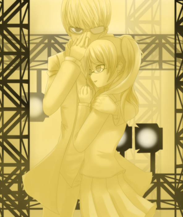 1boy1girlfogglassesheterohuglong hairpleated skirtschool uniformskirtstage lightstwintailsvery long hair