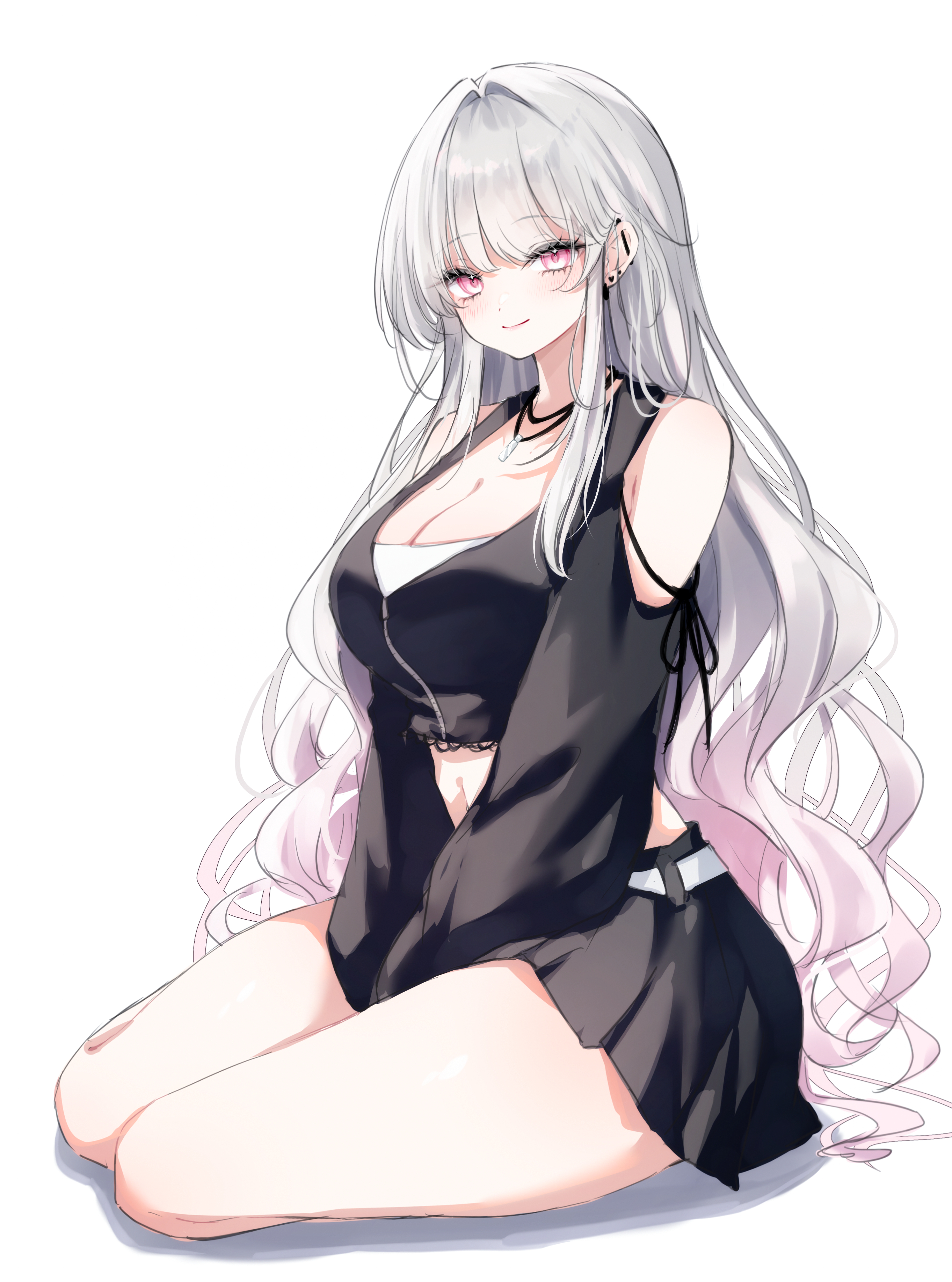 1girlbarbell piercingbare shouldersblack jacketblack skirtbreastscleavageclothing cutoutcropped jacketear piercingearringsgradient hairgrey hairheartheart earringsindustrial piercingjacketjewelrylong hairlooking at viewermidriffmulticolored hairnavelnecklacepiercingpink eyespink hairshirtshoulder cutoutsimple backgroundsittingskirtsmilesolowhite backgroundwhite shirtyokozuwari