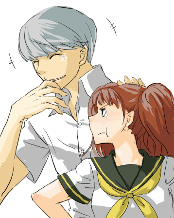 sengnam1997, denji (chainsaw man), reze (chainsaw man), chainsaw man, absurdres, highres, 1boy, 1girl, black necktie, blonde hair, blush, closed mouth, collared shirt, flower, green eyes, hair between eyes, holding, holding flower, hug, hug from behind, necktie, open mouth, orange eyes, purple hair, sharp teeth, shirt, short hair, sleeveless, sleeveless shirt, sweat, teeth, white flower, white shirt