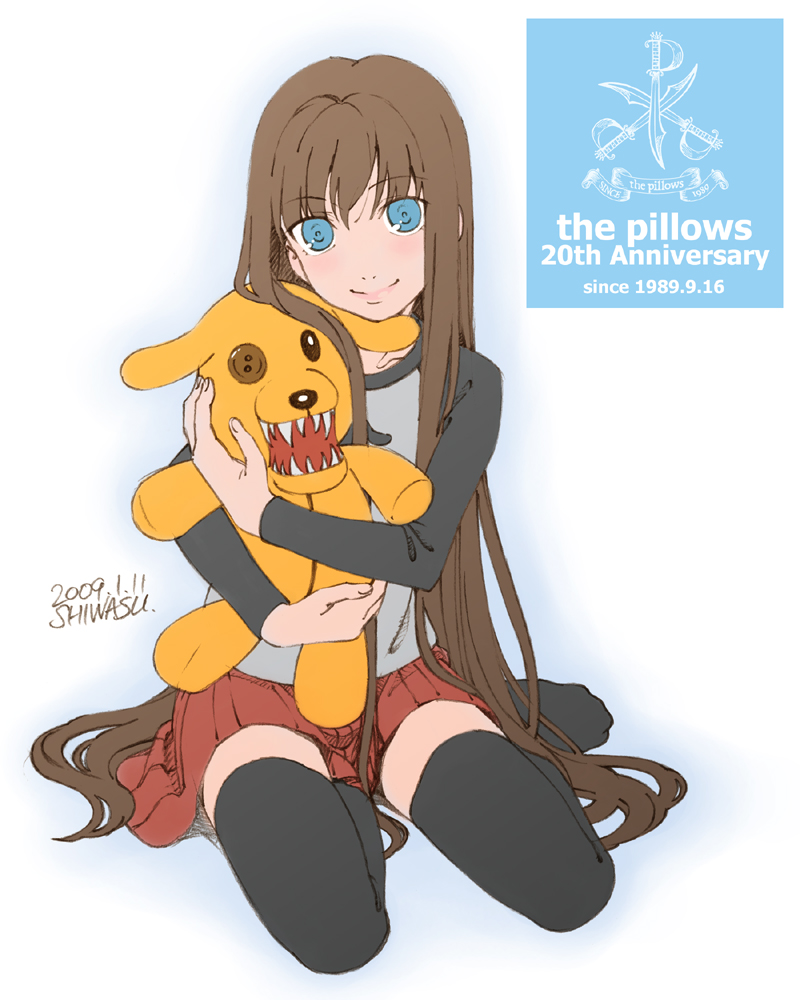 blue eyesblushbrown hairkneelinglong hairskirtsmilesolostuffed animalstuffed toythighhighsvery long hair