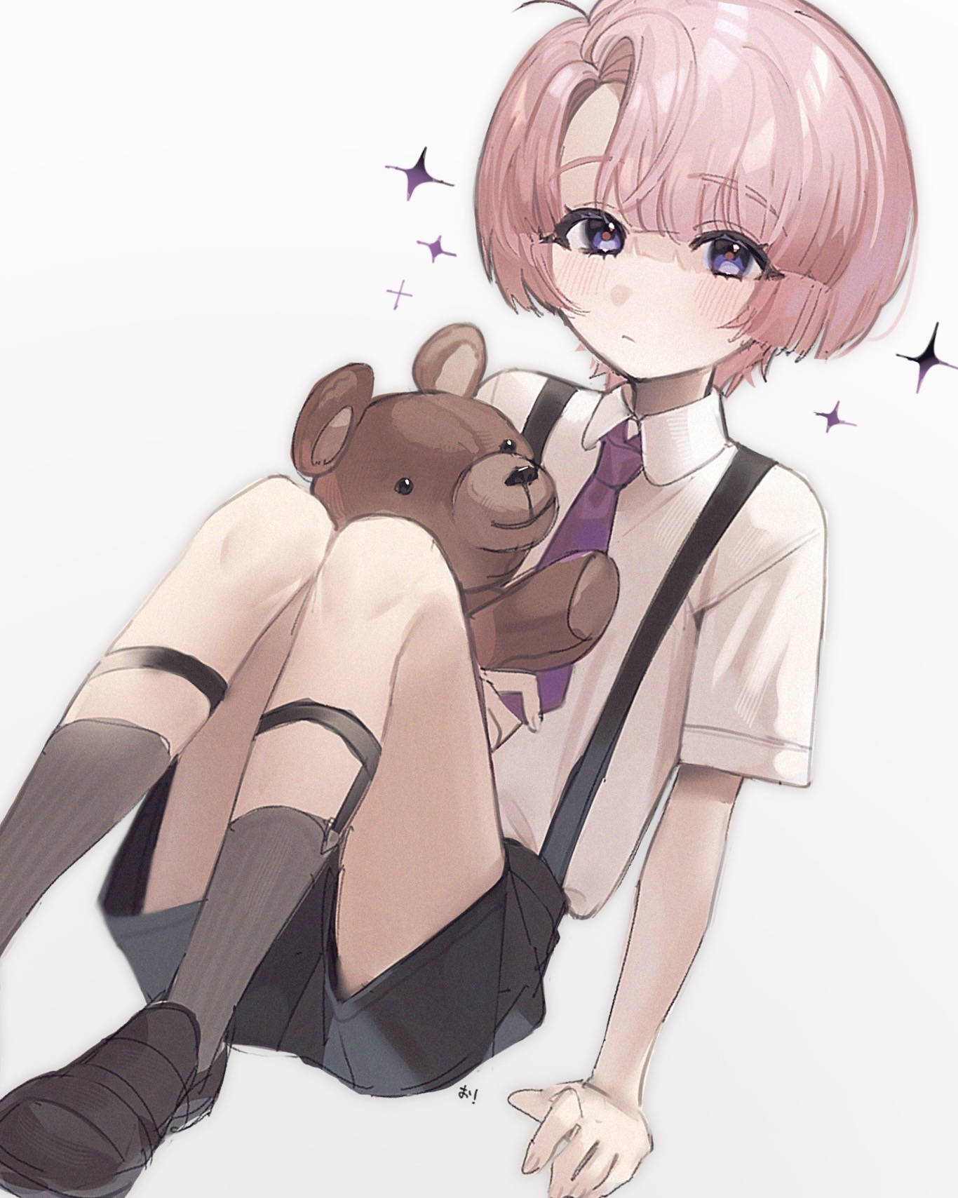 nancy980216, kanzaki souma, ensemble stars!, 1boy, :d, ahoge, alternate costume, beach, blue sky, border, brown sandals, chibi, chibi only, cloud, double-parted bangs, floating hair, hair between eyes, hair intakes, holding, holding stuffed toy, knee up, koi, long hair, male swimwear, motoyui, multicolored shorts, ocean, open mouth, pink ribbon, pink shirt, pink shorts, ponytail, purple eyes, ribbon, round image, sandals, seashell, shell, shirt, shore, short sleeves, shorts, sidelocks, sky, smile, solo, standing, standing on one leg, starfish, stuffed animal, stuffed toy, stuffed turtle, teeth, upper teeth only, v-shaped eyebrows, water, water drop, white border, yellow shorts