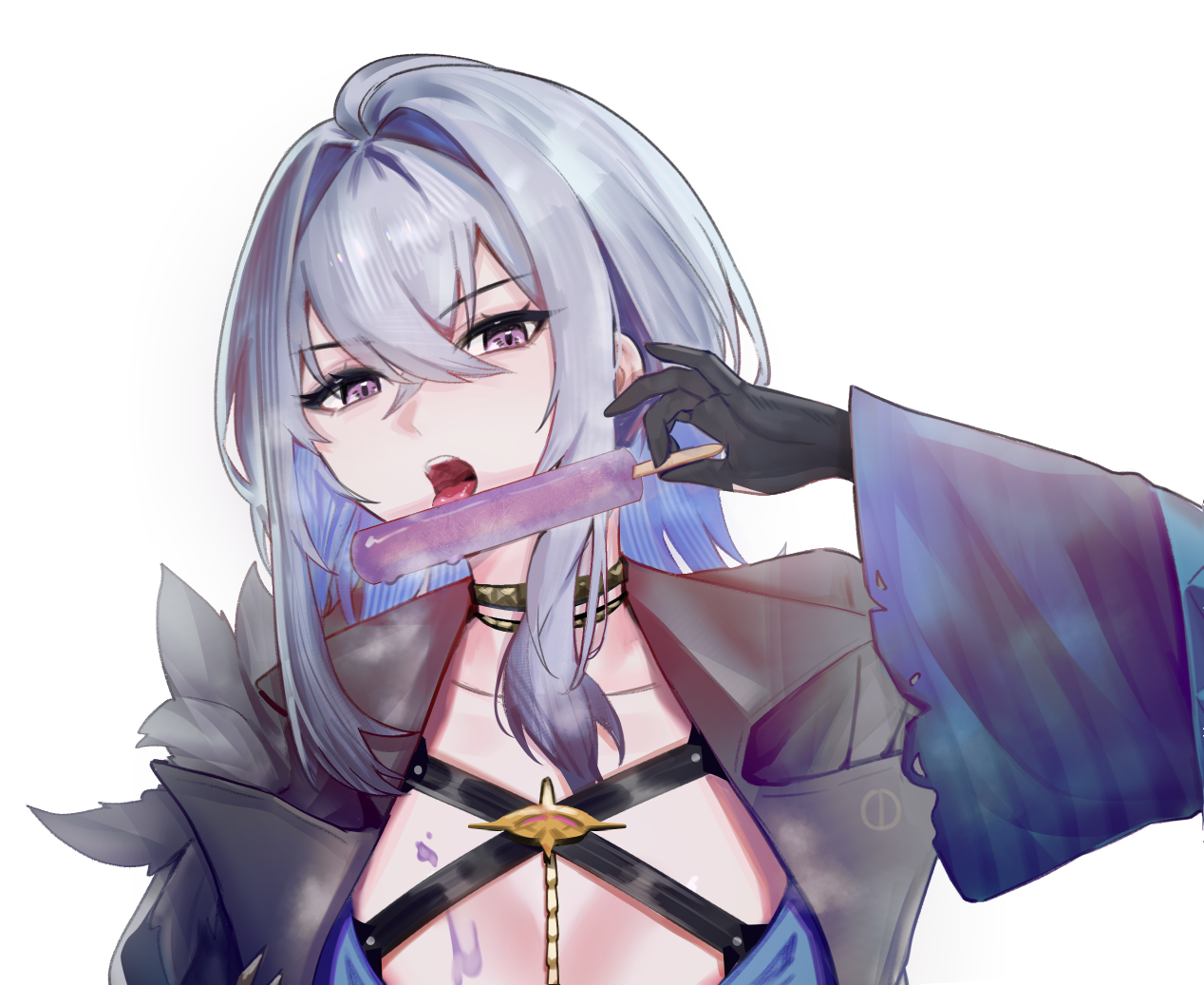 1girlblack glovesblack jacketblue haircolored inner hairfoodglovesgold chokergrey hairhair between eyesholdingholding foodholding popsiclejacketlickinglooking at viewermedium hairmulticolored hairpopsicleportraitpurple eyessimple backgroundsolowhite background