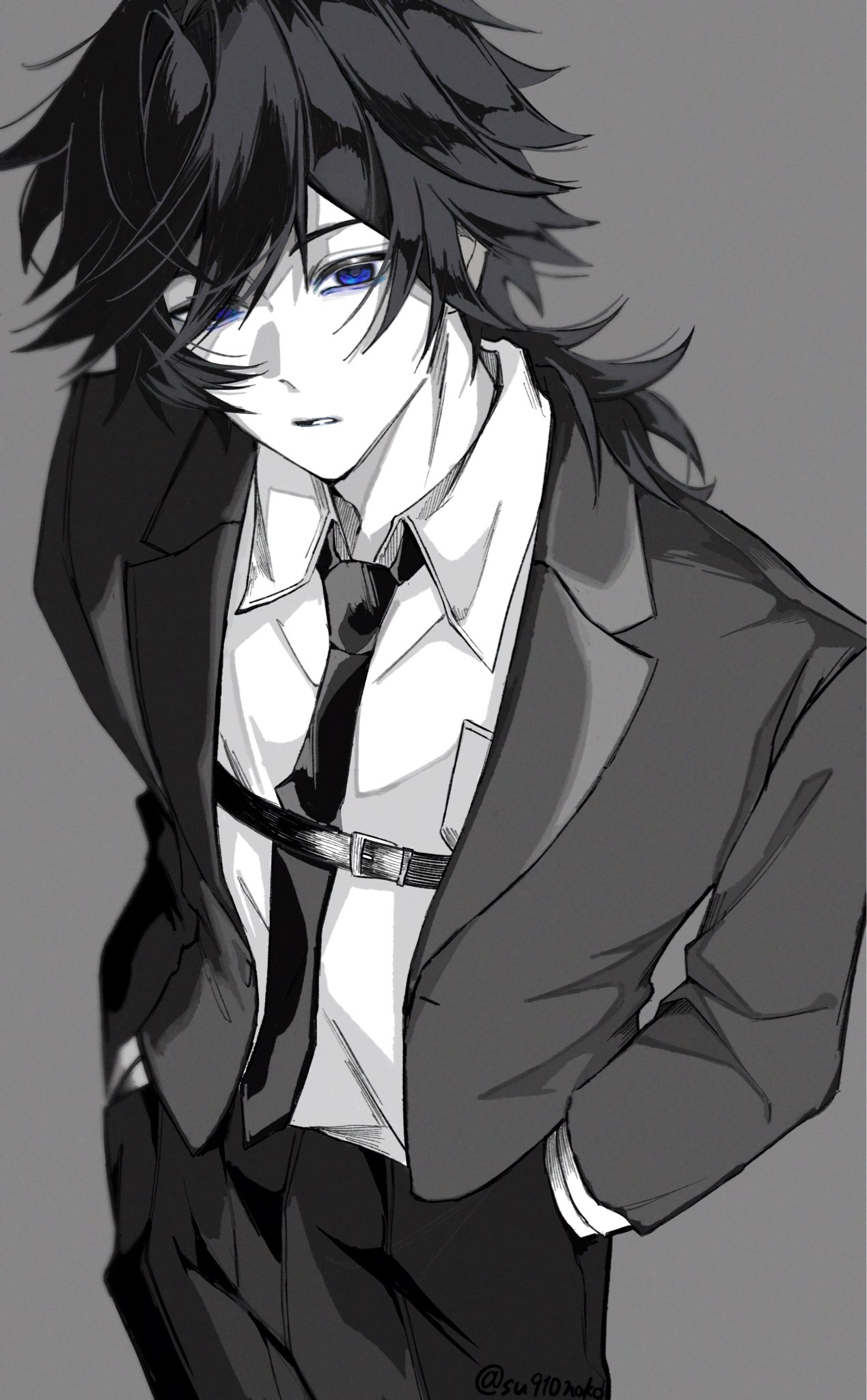alternate costumeblue eyescollared shirtcowboy shotgrey backgroundgreyscalehair between eyeshalf-closed eyeshands in pocketshaorijapanese clotheslooking at viewerlow ponytailmale focusmonochromenecktieparted lipspartially coloredponytailred haorishirtsimple backgroundspiked hairsu910nokoteethtwitter username