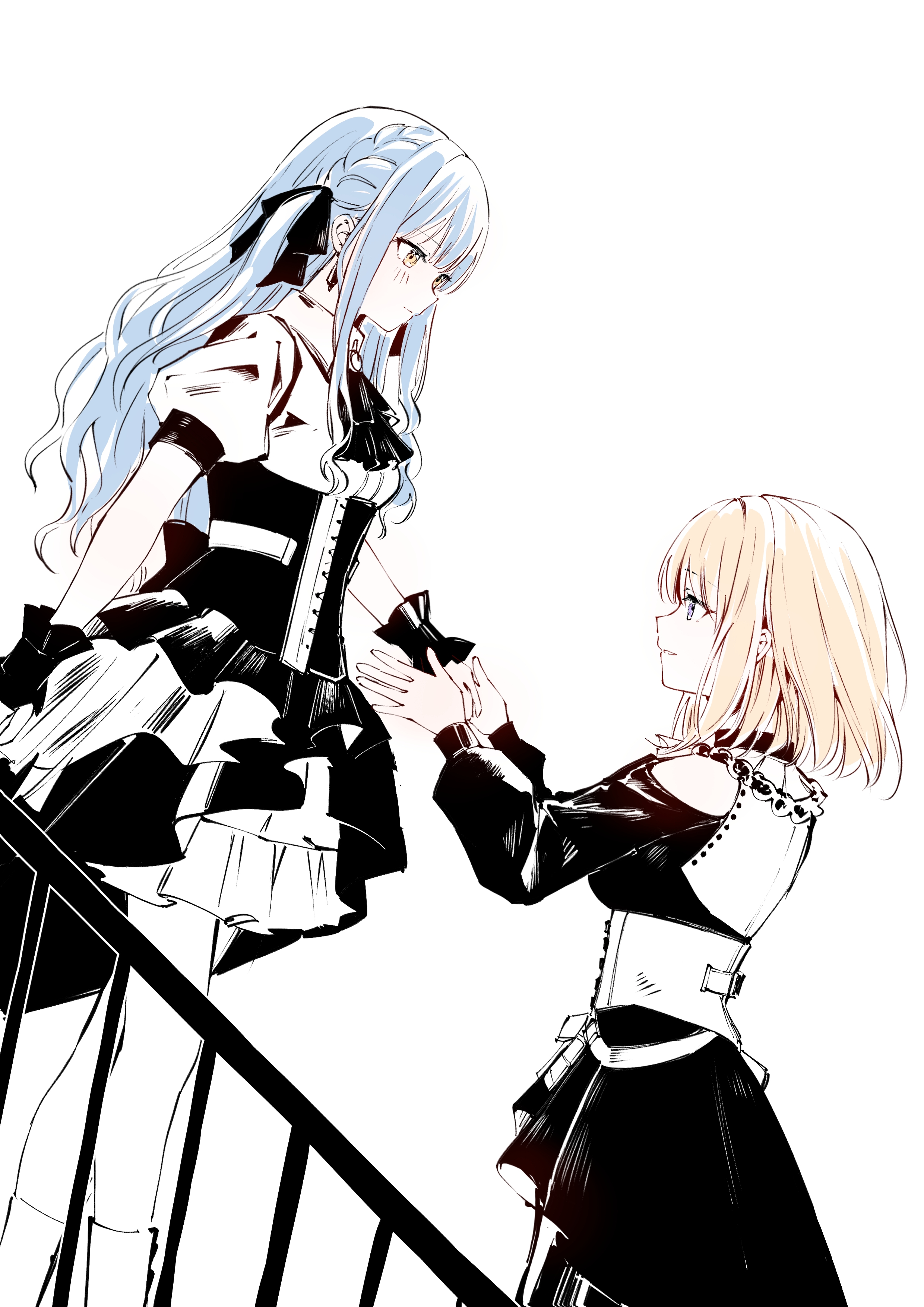 2girlsblonde hairblue hairblushbraidclosed mouthcorsetdressearringsholding handsjewelrylimited palettelong hairmedium hairmultiple girlsopen mouthrailingshirtsidelockssimple backgroundwhite backgroundwrist cuffsyellow eyes