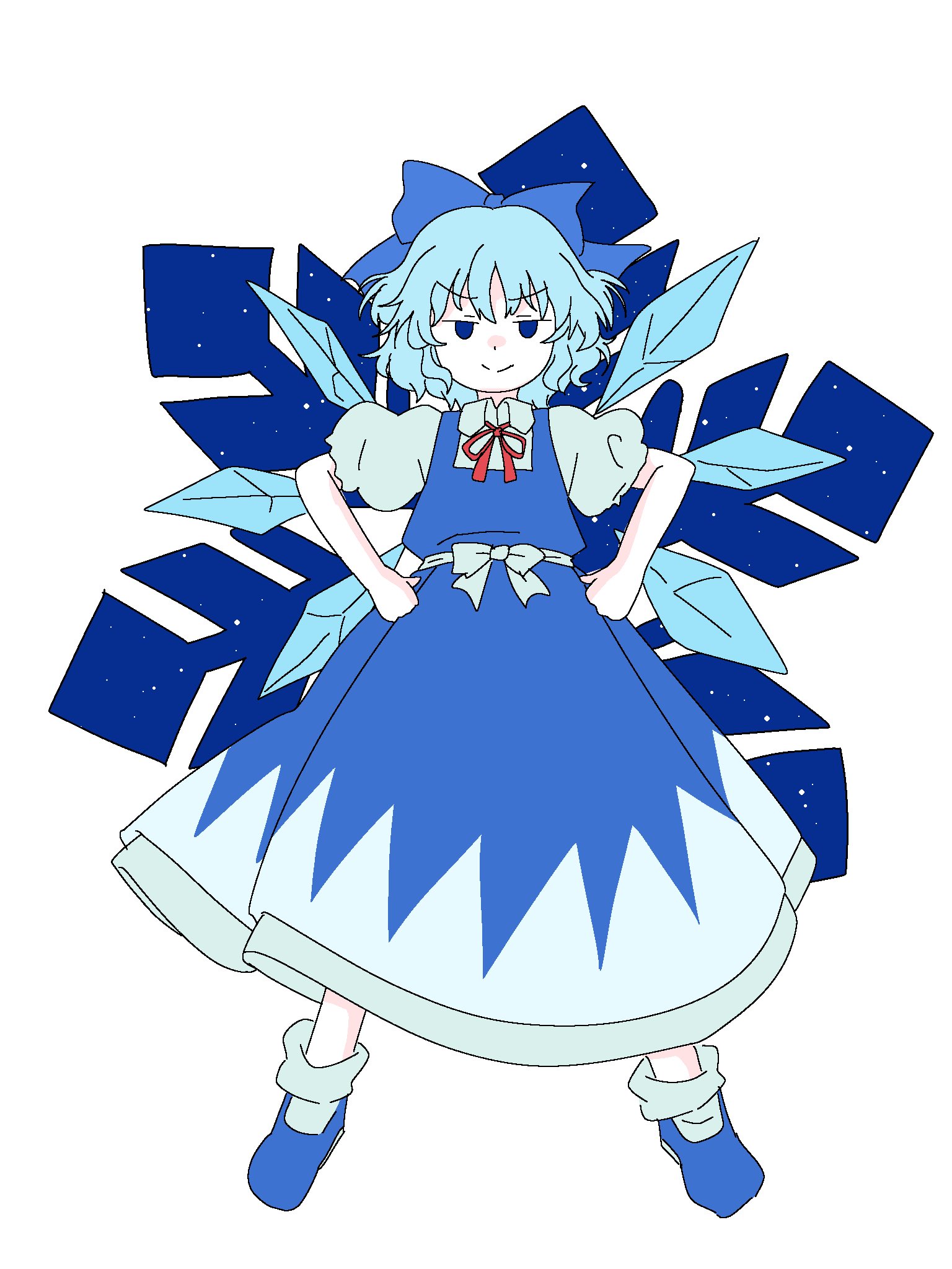 1girlblue bowblue dressblue eyesblue hairblue shoesbowclosed mouthcollared shirtdressfloatingfull bodyhair bowhands on own hipsiceice wingslooking at viewernama 114514neck ribbonpuffy short sleevespuffy sleevesred ribbonribbonshirtshoesshort hairshort sleevessimple backgroundsmilesoloteethwhite backgroundwhite shirtwings