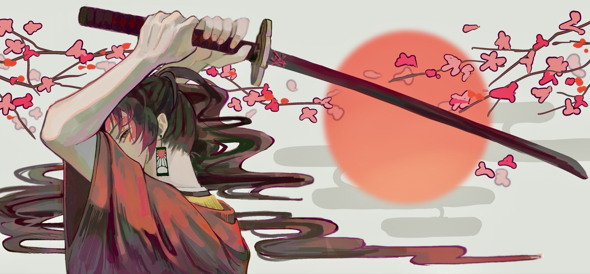 1boyarms upcovered mouthearringsem95vforehead tattoohalf-closed eyeshanafudahanafuda earringshaoriholdingholding swordholding weaponjapanese clothesjewelrykatanakimonolong hairlooking at viewermale focusmoonred eyesred hairred haorired moonred tattoosoloswordtattooupper bodyvery long hairweaponyellow kimono