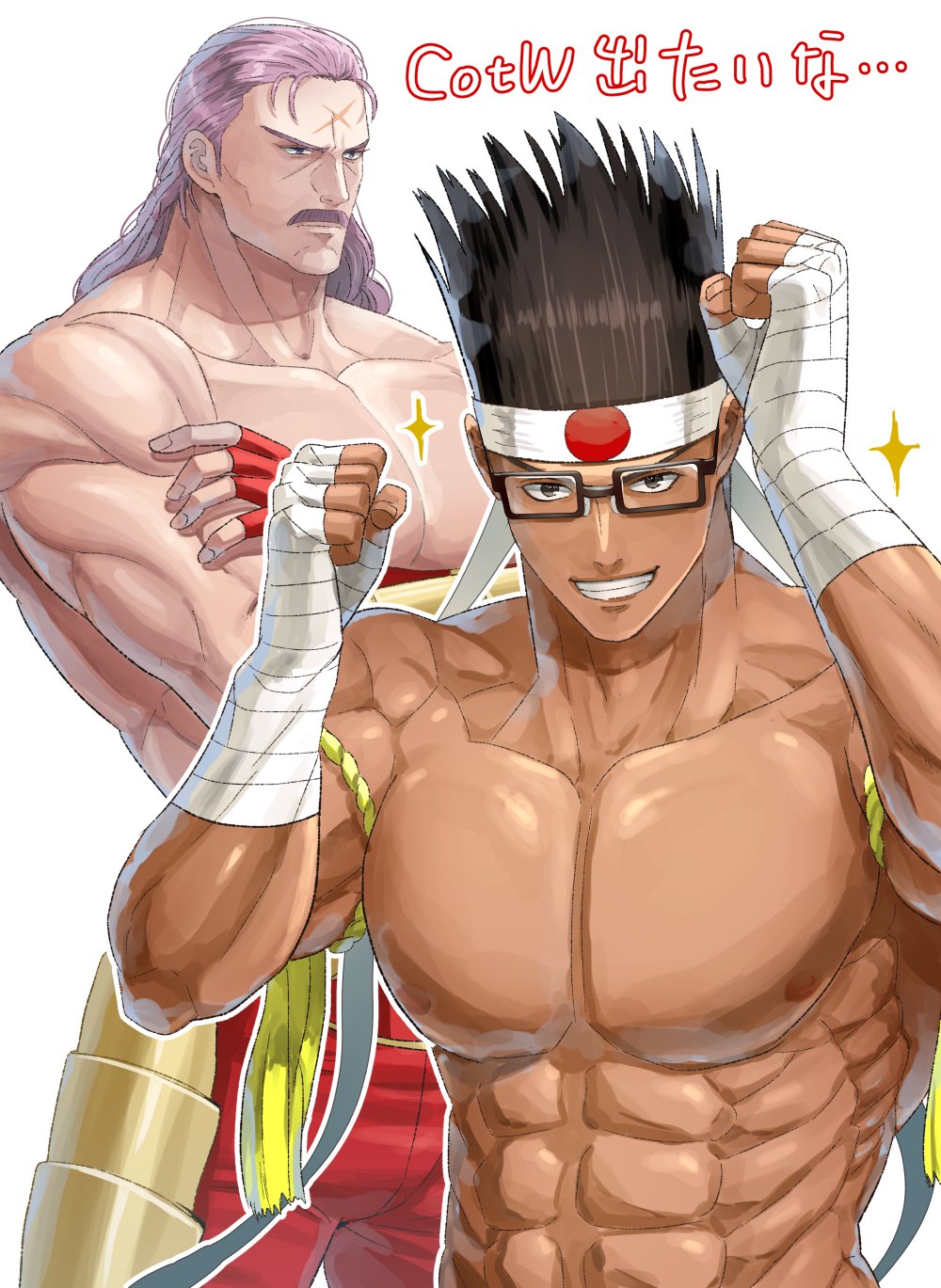 2boysabsbandaged handbandagesblack hairblack-framed eyewearbrown eyesclenched handscross scarcrossed armsfacial hairfighting stancefingerless glovesglassesglovesgrinheadbandlong hairlooking at viewermale focusmultiple boysmuscularmuscular malemustacheobliquespantspectoralspurple hairred glovesred pantsscarscar on facescar on foreheadshort hairsimple backgroundsmilesparklespiked hairtopless malev-shaped eyebrowswhite background