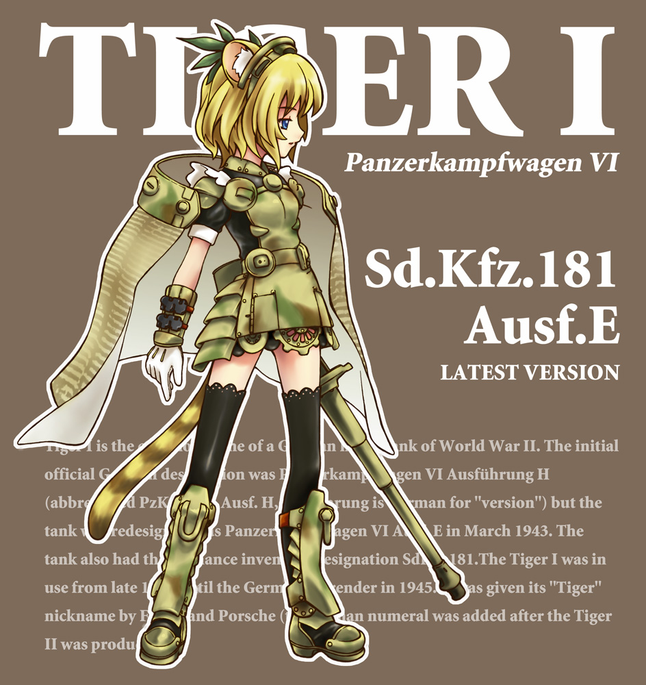 1girlanimal earsarmorbootscapeenglish textfemale focusglovesmecha musumemilitarymilitary vehiclemotor vehiclepersonificationsolotankthighhighstiger iwehrmachtworld war ii