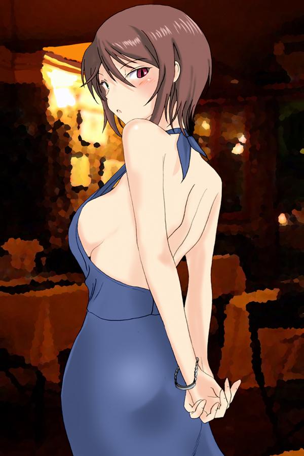 00s1girlaged upbare shouldersbraceletbreastsbrown haircasualdressfemale focusgreen eyesheterochromiajewelrylooking backmedium breastsno brared eyesshort hairsideboobsolo