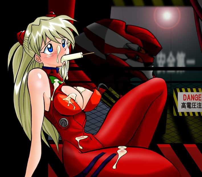 1girlalternate breast size (larger)alternate hair colorblue eyesbodysuitbreastscleavagefoodhumanoid robotlarge breastsmecha pilot suitopen bodysuitopen clothesphallic symbolplugsuit (evangelion)popsiclerobotsexually suggestive