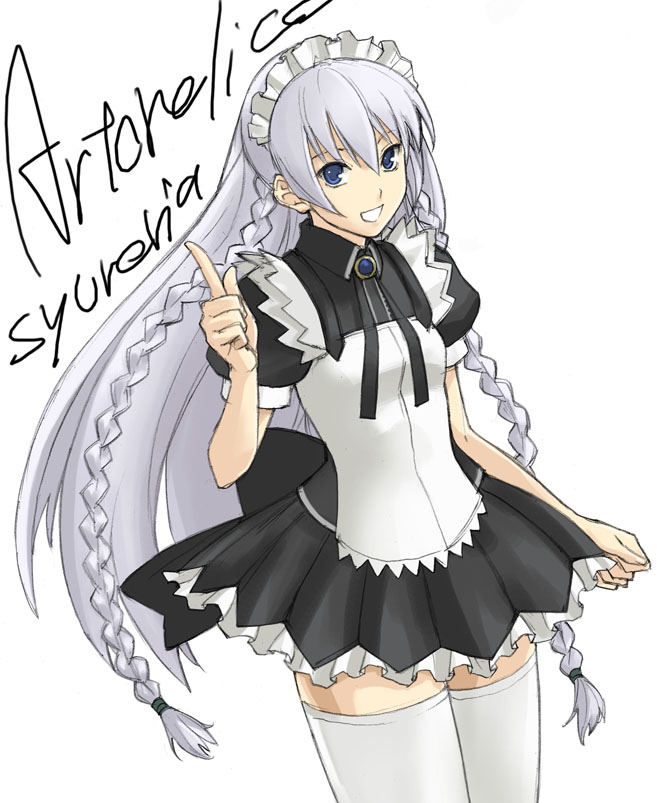 00s1girlalternate costumeapronblue eyesbowbraidbreastsbroochcharacter nameclenched handcopyright namecowboy shotdressfemale focusfrilled dressfrillsgrinhair between eyesindex finger raisedjewelrylong hairlooking at viewermaidmaid apronmaid headdressnecktiepetticoatpleated dresspuffy sleevesshort dressshort sleevessmall breastssmilesolothighhighstwin braidsvery long hairwhite hairwhite thighhighszettai ryouiki